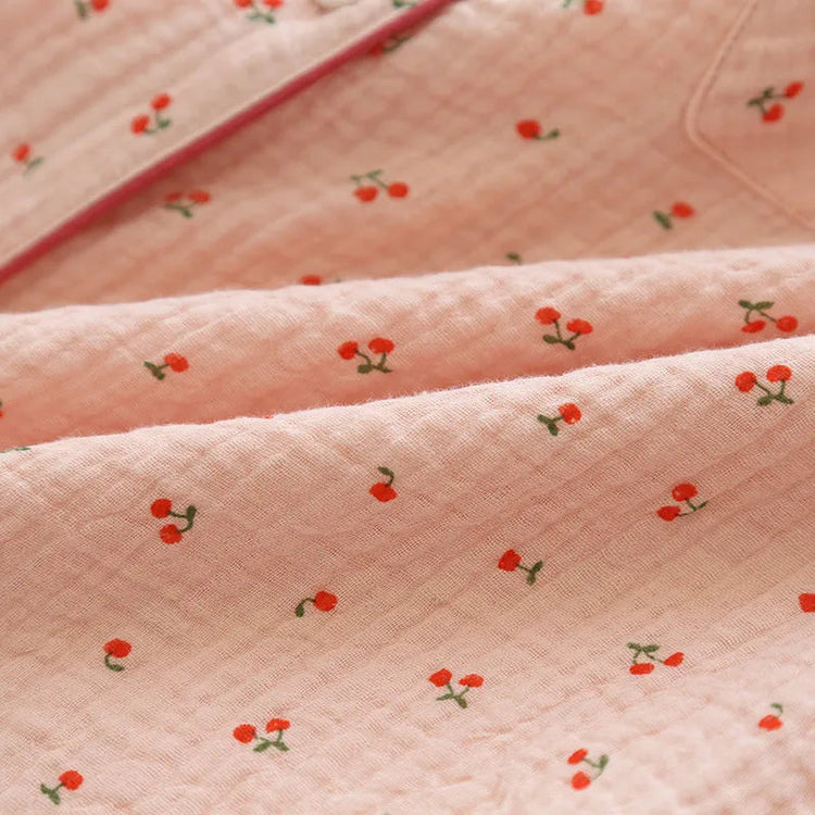 Notre ensemble deux pièces est confectionné en mousseline de coton 100 % à la maille aérée pour une respirabilité optimale. Le haut boutonné et le pantalon à taille élastiquée offrent une coupe décontractée, tandis que l'imprimé cerises apporte une touche de fantaisie. Il s'adoucit magnifiquement lavage après lavage.